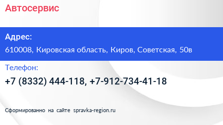 Автосервис по адресу 610008, Кировская область, Киров, Советская, 50в в дальнейшем Организация, размещена в следующих категориях: