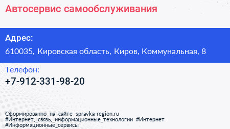 Автосервис самообслуживания по адресу 610035, Кировская область, Киров, Коммунальная, 8 в дальнейшем Организация, размещена в следующих категориях:
