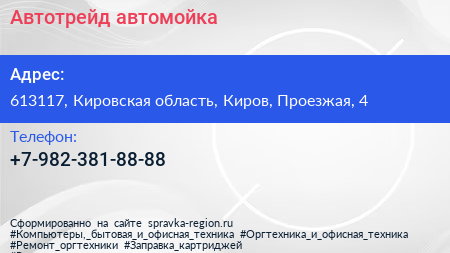 Автотрейд, автомойка по адресу 613117, Кировская область, Киров, Проезжая, 4 в дальнейшем Организация, размещена в следующих категориях: