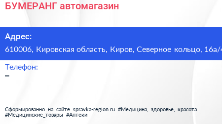БУМЕРАНГ, автомагазин по адресу 610006, Кировская область, Киров, Северное кольцо, 16а/4 в дальнейшем Организация, размещена в следующих категориях: