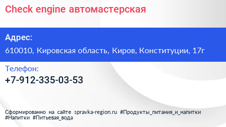 Check engine, автомастерская по адресу 610010, Кировская область, Киров, Конституции, 17г в дальнейшем Организация, размещена в следующих категориях: