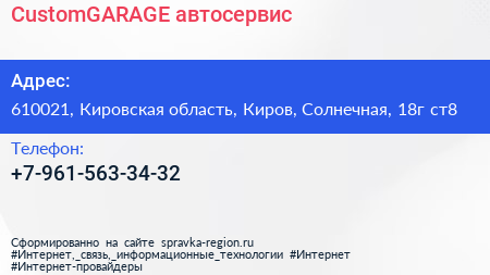 CustomGARAGE, автосервис по адресу 610021, Кировская область, Киров, Солнечная, 18г ст8 в дальнейшем Организация, размещена в следующих категориях: