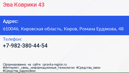 Эва Коврики 43 по адресу 610046, Кировская область, Киров, Романа Ердякова, 48 в дальнейшем Организация, размещена в следующих категориях:
