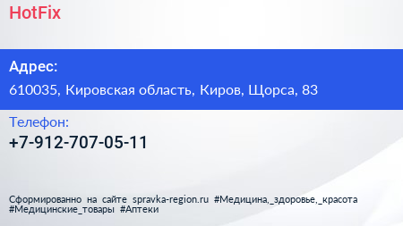 HotFix по адресу 610035, Кировская область, Киров, Щорса, 83 в дальнейшем Организация, размещена в следующих категориях: