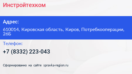 Инстройтехком по адресу 610014, Кировская область, Киров, Потребкооперации, 26Б в дальнейшем Организация, размещена в следующих категориях: