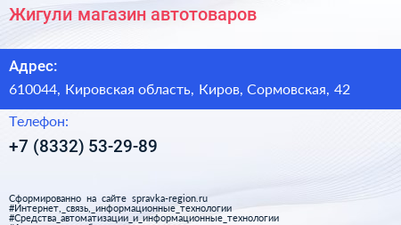 Жигули, магазин автотоваров по адресу 610044, Кировская область, Киров, Сормовская, 42 в дальнейшем Организация, размещена в следующих категориях: