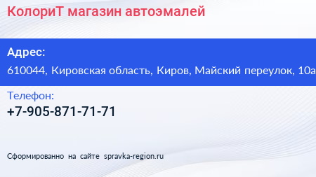 КолориТ, магазин автоэмалей по адресу 610044, Кировская область, Киров, Майский переулок, 10а в дальнейшем Организация, размещена в следующих категориях: