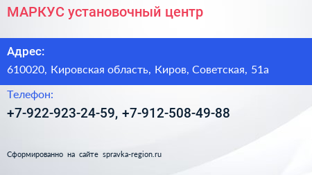 МАРКУС, установочный центр по адресу 610020, Кировская область, Киров, Советская, 51а в дальнейшем Организация, размещена в следующих категориях: