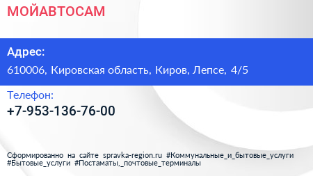 МОЙАВТОСАМ по адресу 610006, Кировская область, Киров, Лепсе, 4/5 в дальнейшем Организация, размещена в следующих категориях: