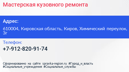 Мастерская кузовного ремонта по адресу 610004, Кировская область, Киров, Химический переулок, 3г в дальнейшем Организация, размещена в следующих категориях: