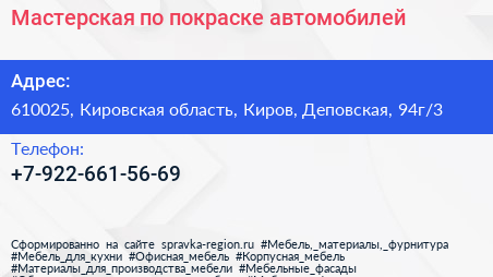 Мастерская по покраске автомобилей по адресу 610025, Кировская область, Киров, Деповская, 94г/3 в дальнейшем Организация, размещена в следующих категориях: