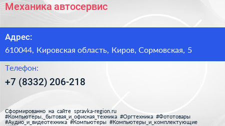 Механика, автосервис по адресу 610044, Кировская область, Киров, Сормовская, 5 в дальнейшем Организация, размещена в следующих категориях: