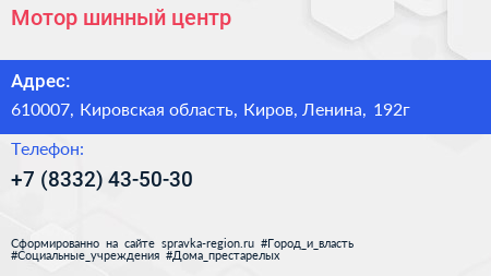 Мотор, шинный центр по адресу 610007, Кировская область, Киров, Ленина, 192г в дальнейшем Организация, размещена в следующих категориях: