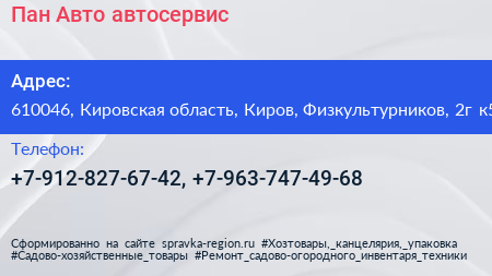 Пан-Авто, автосервис по адресу 610046, Кировская область, Киров, Физкультурников, 2г к5 в дальнейшем Организация, размещена в следующих категориях: