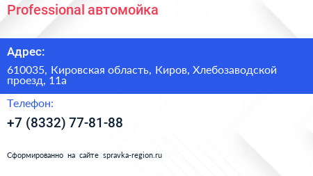 Professional, автомойка по адресу 610035, Кировская область, Киров, Хлебозаводской проезд, 11а в дальнейшем Организация, размещена в следующих категориях: