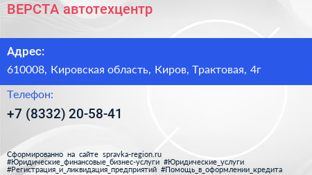 ВЕРСТА, автотехцентр по адресу 610008, Кировская область, Киров, Трактовая, 4г в дальнейшем Организация, размещена в следующих категориях: