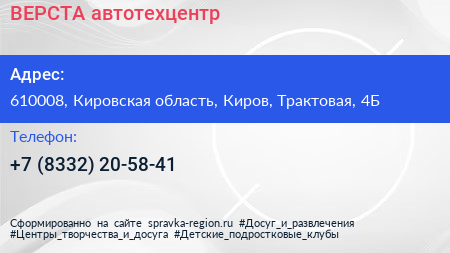ВЕРСТА, автотехцентр по адресу 610008, Кировская область, Киров, Трактовая, 4Б в дальнейшем Организация, размещена в следующих категориях: