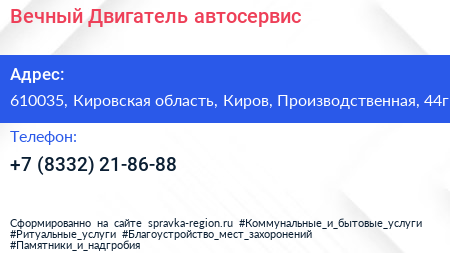 Вечный Двигатель, автосервис по адресу 610035, Кировская область, Киров, Производственная, 44г в дальнейшем Организация, размещена в следующих категориях: