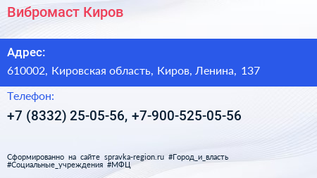 Вибромаст Киров по адресу 610002, Кировская область, Киров, Ленина, 137 в дальнейшем Организация, размещена в следующих категориях: