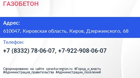 ГАЗОБЕТОН по адресу 610047, Кировская область, Киров, Дзержинского, 68 в дальнейшем Организация, размещена в следующих категориях: