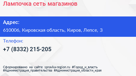 Лампочка, сеть магазинов по адресу 610006, Кировская область, Киров, Лепсе, 3 в дальнейшем Организация, размещена в следующих категориях: