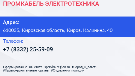 ПРОМКАБЕЛЬ ЭЛЕКТРОТЕХНИКА по адресу 610035, Кировская область, Киров, Калинина, 40 в дальнейшем Организация, размещена в следующих категориях: