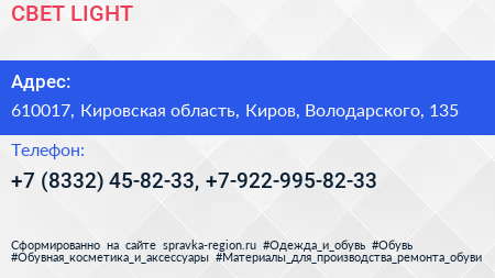 СВЕТ & LIGHT по адресу 610017, Кировская область, Киров, Володарского, 135 в дальнейшем Организация, размещена в следующих категориях:
