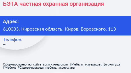 БЭТА, частная охранная организация по адресу 610033, Кировская область, Киров, Воровского, 113 в дальнейшем Организация, размещена в следующих категориях: