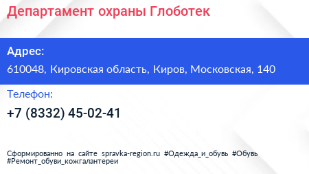 Департамент охраны Глоботек по адресу 610048, Кировская область, Киров, Московская, 140 в дальнейшем Организация, размещена в следующих категориях: