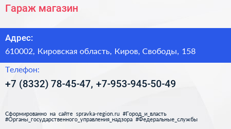Гараж, магазин по адресу 610002, Кировская область, Киров, Свободы, 158 в дальнейшем Организация, размещена в следующих категориях: