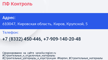 ПФ Контроль по адресу 610047, Кировская область, Киров, Крупской, 5 в дальнейшем Организация, размещена в следующих категориях: