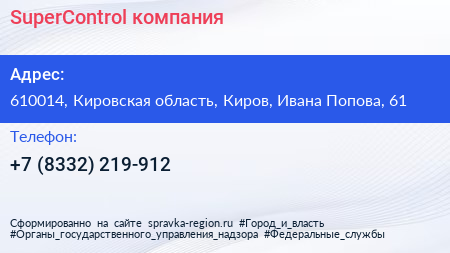 SuperControl, компания по адресу 610014, Кировская область, Киров, Ивана Попова, 61 в дальнейшем Организация, размещена в следующих категориях: