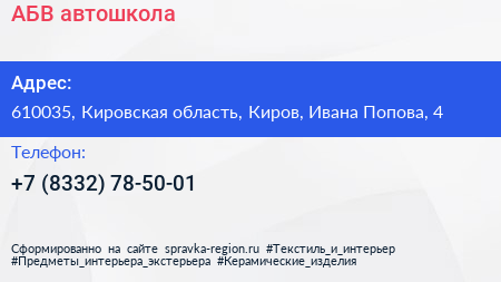 АБВ, автошкола по адресу 610035, Кировская область, Киров, Ивана Попова, 4 в дальнейшем Организация, размещена в следующих категориях: