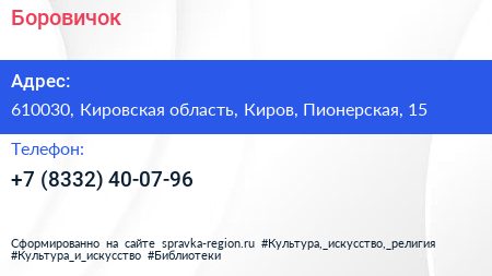 Боровичок по адресу 610030, Кировская область, Киров, Пионерская, 15 в дальнейшем Организация, размещена в следующих категориях: