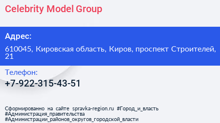 Celebrity Model Group по адресу 610045, Кировская область, Киров, проспект Строителей, 21 в дальнейшем Организация, размещена в следующих категориях: