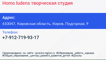 Homo ludens, творческая студия по адресу 610047, Кировская область, Киров, Подгорная, 9 в дальнейшем Организация, размещена в следующих категориях: