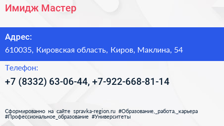 Имидж Мастер по адресу 610035, Кировская область, Киров, Маклина, 54 в дальнейшем Организация, размещена в следующих категориях: