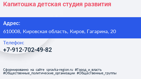Капитошка, детская студия развития по адресу 610008, Кировская область, Киров, Гагарина, 20 в дальнейшем Организация, размещена в следующих категориях: