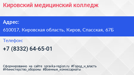 Кировский медицинский колледж по адресу 610017, Кировская область, Киров, Спасская, 67Б в дальнейшем Организация, размещена в следующих категориях: