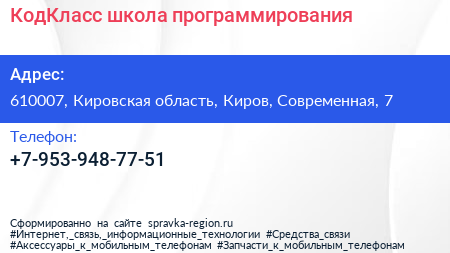 КодКласс, школа программирования по адресу 610007, Кировская область, Киров, Современная, 7 в дальнейшем Организация, размещена в следующих категориях: