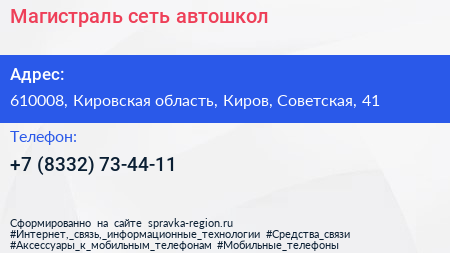 Магистраль, сеть автошкол по адресу 610008, Кировская область, Киров, Советская, 41 в дальнейшем Организация, размещена в следующих категориях: