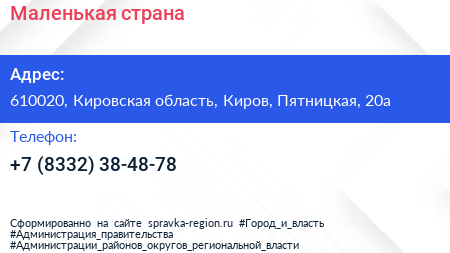 Маленькая страна по адресу 610020, Кировская область, Киров, Пятницкая, 20а в дальнейшем Организация, размещена в следующих категориях: