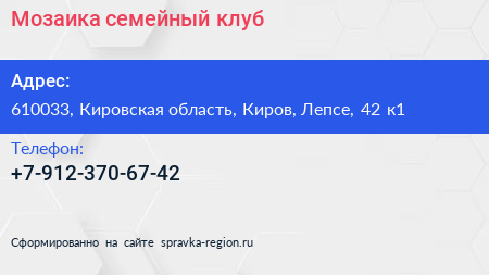 Мозаика, семейный клуб по адресу 610033, Кировская область, Киров, Лепсе, 42 к1 в дальнейшем Организация, размещена в следующих категориях: