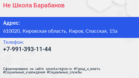 Не Школа Барабанов по адресу 610020, Кировская область, Киров, Спасская, 15а в дальнейшем Организация, размещена в следующих категориях: