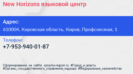 New Horizons, языковой центр по адресу 610004, Кировская область, Киров, Профсоюзная, 1 в дальнейшем Организация, размещена в следующих категориях: