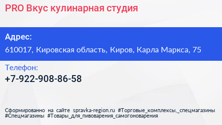 PRO Вкус, кулинарная студия по адресу 610017, Кировская область, Киров, Карла Маркса, 75 в дальнейшем Организация, размещена в следующих категориях: