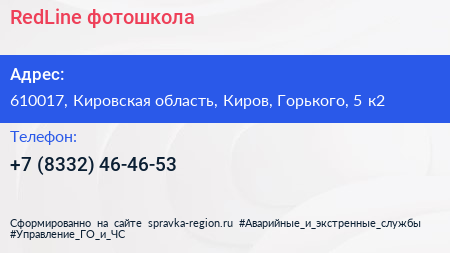 RedLine, фотошкола по адресу 610017, Кировская область, Киров, Горького, 5 к2 в дальнейшем Организация, размещена в следующих категориях: