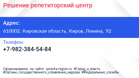 Решение, репетиторский центр по адресу 610002, Кировская область, Киров, Ленина, 92 в дальнейшем Организация, размещена в следующих категориях: