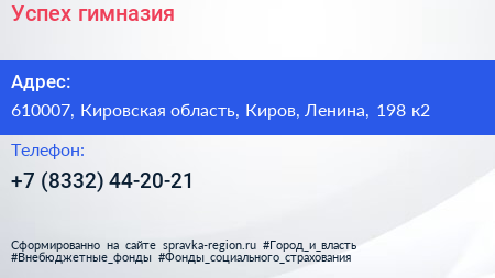 Успех, гимназия по адресу 610007, Кировская область, Киров, Ленина, 198 к2 в дальнейшем Организация, размещена в следующих категориях: