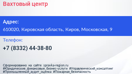 Вахтовый центр по адресу 610020, Кировская область, Киров, Московская, 9 в дальнейшем Организация, размещена в следующих категориях: